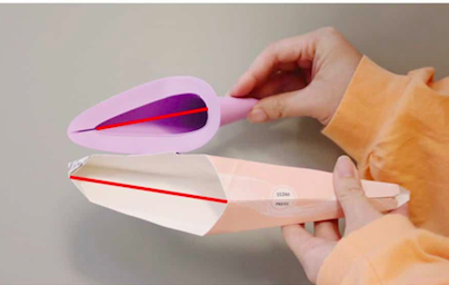 使うときは筒状ではなく皿状になっている側を股に当てて。立った姿勢のままでも無理なくオシッコが可能です。使用後は流さずにゴミ箱に捨ていただければOKです。
