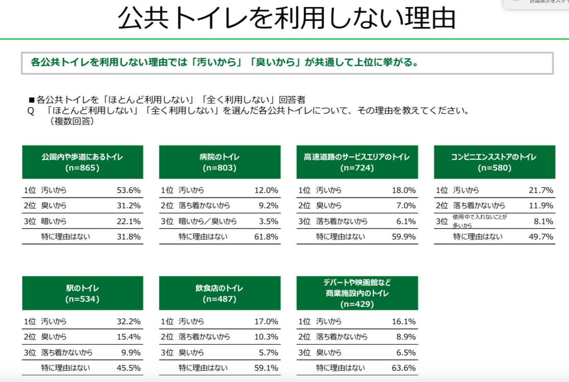 公園など野外のトイレだけでなく、デパートやコンビニエンスストアなどの公共トイレについても苦手意識を持つ方が多い方がわかりました。その理由はやはり衛生面で問題があると考える方が多いよう。出典:日本財団による18歳意識調査「第38回 – 公共トイレ –」要約版