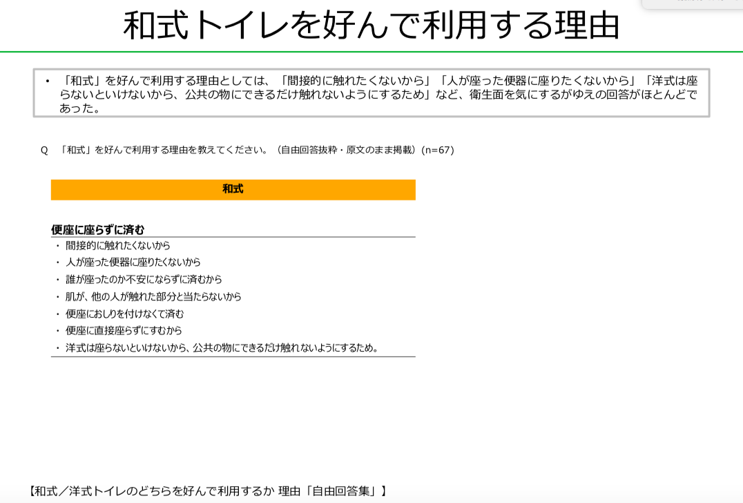 洋式トイレ、和式トイレ、どちらを意識して利用するかという問いに対し、洋式と答える方が圧倒的に多かったものの、和式を選んだ方の回答理由からは切実な苦手意識を感じ取ることができます。出典:日本財団による18歳意識調査「第38回 – 公共トイレ –」要約版