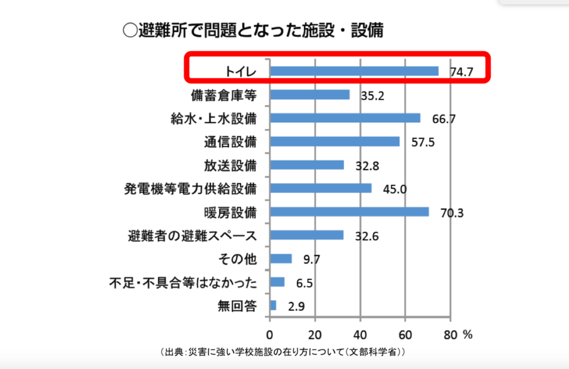 災害後に避難所生活を送られた方にお聞きした調査では、衣食住を抜いて「トイレ」の問題が多く起きていたことがわかりました。出典:名古屋大学エコトピア科学研究所「災害時のトイレの課題と今度の対応」/文部科学省「災害に強い学校施設の在り方について」
