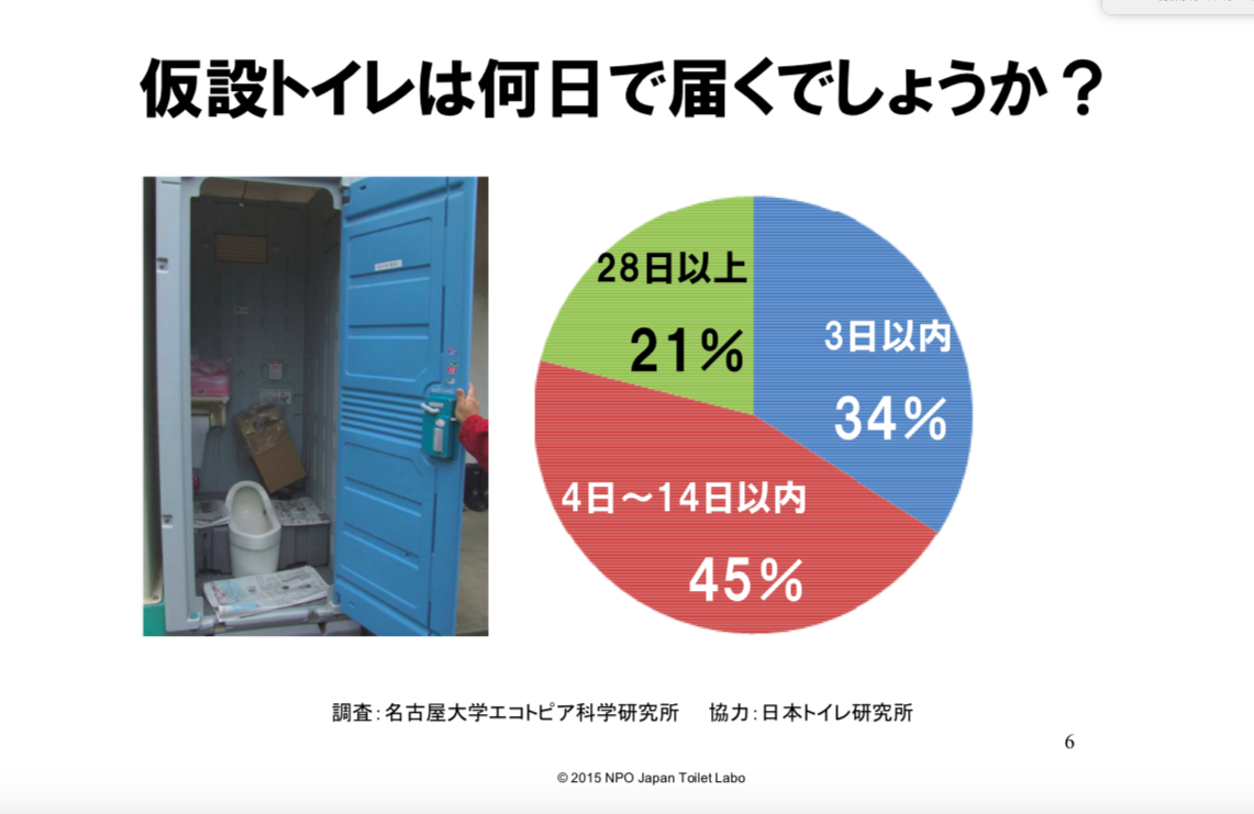 被災地の避難所に仮設トイレが設置されるまでかかった日数は、4日から14日後だったケースが半数近いという衝撃の事実が。出典:名古屋大学エコトピア科学研究所「災害時のトイレの課題と今後の対応」(調査:名古屋大学エコトピア科学研究所 協力:日本トイレ研究所)