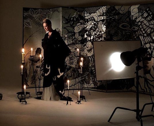 グラフィックアート特集のページにも登場する、「百鬼夜行」(YONABE/IKKOTORCIDA、KENSUKE TAKAHASHI、ZONZAI、BAKIBAKI)の屏風を背景に、和蠟燭の灯りがゆらめく中で撮影がスタート。まるで演舞をしているような夏木マリさんの圧倒的な存在感に、スタジオは神々しい雰囲気に包まれました。