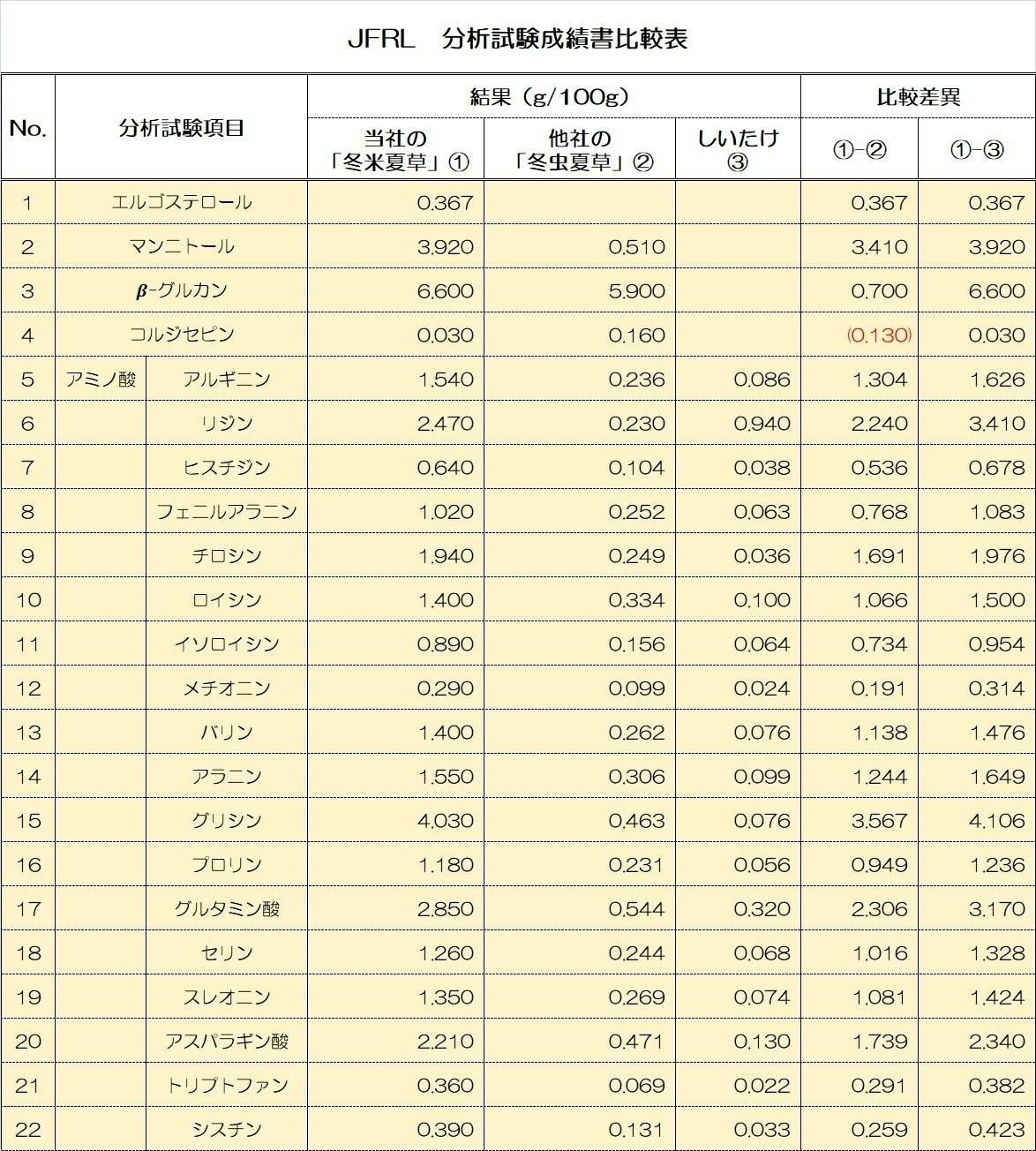 日本食品分析センターによる成分分析では、当社の「冬米夏草」には18種類のアミノ酸が含まれており、高い栄養価があることがわかりました。