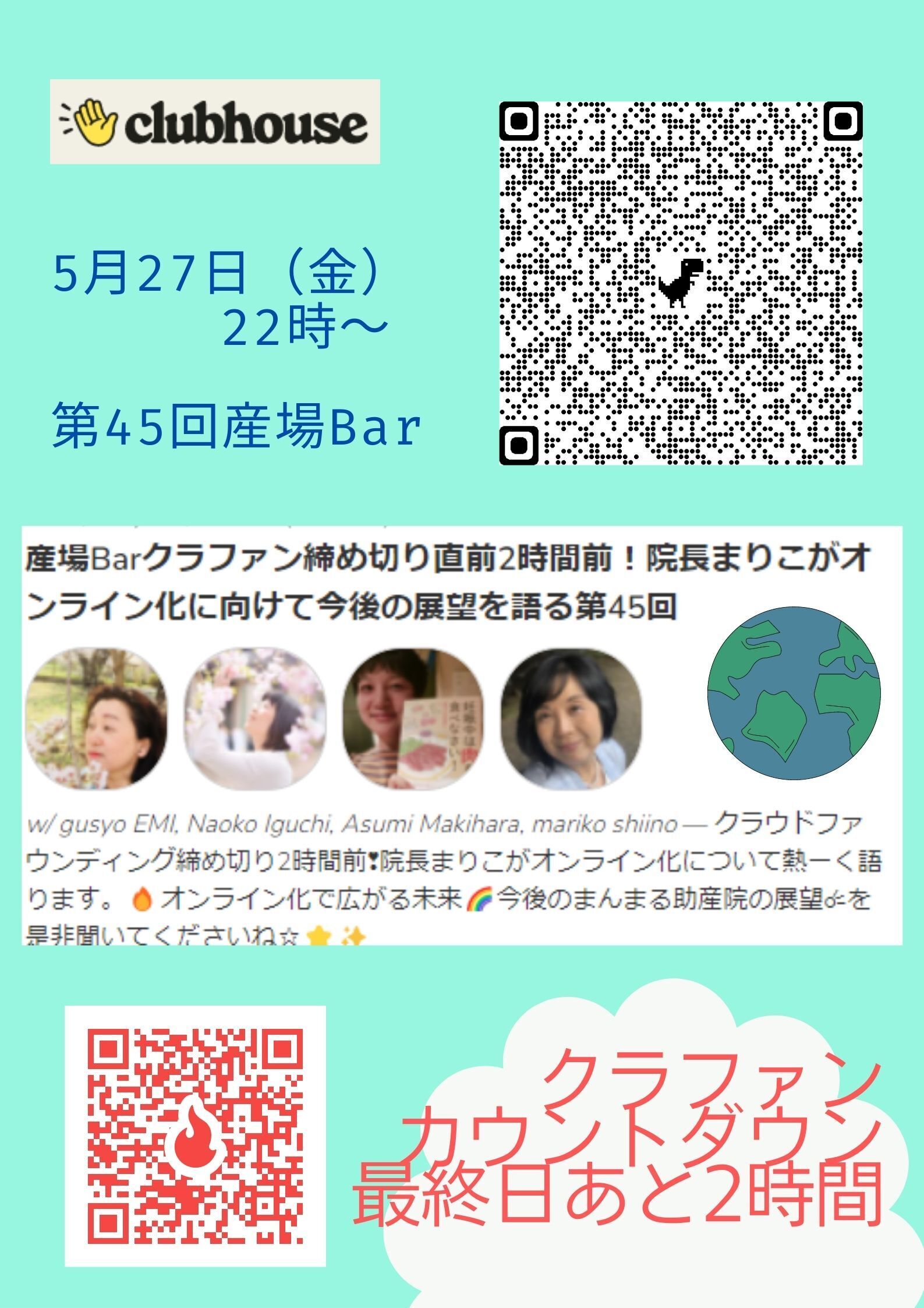 2022/05/27 18:01今日の23時59分にクラウドファウンディングが締め切りとなります。多くの皆様にご支援応援いただきありがとうございました。このオンラインでも受講できるからこそ、「妊婦の学校」として遠方の方にもサービスできるように今後とも活動してまいります。あと2時間、まだまだ、目標額まで頑張りたいと思いますので、皆様ご支援よろしくお願い致します。今日再度22時にクラブハウス”産場Bar”でまりこ院長がこのクラファンのことを話しますので、どうぞお聞きください。https://www.clubhouse.com/join/%E7%94%A3%E5%A0%B4bar/ZVdKwfvc/xXJVQ7qK?utm_medium=ch_invite&utm_campaign=hxnFDUgHxZdDwi0csPD6hQ-210282&fbclid=IwAR25SROzNu9SLO0_SIWYsn51jd97yH5V5_-Q_pSQFUfAf02s86G4FuFq3i8 もっと見る