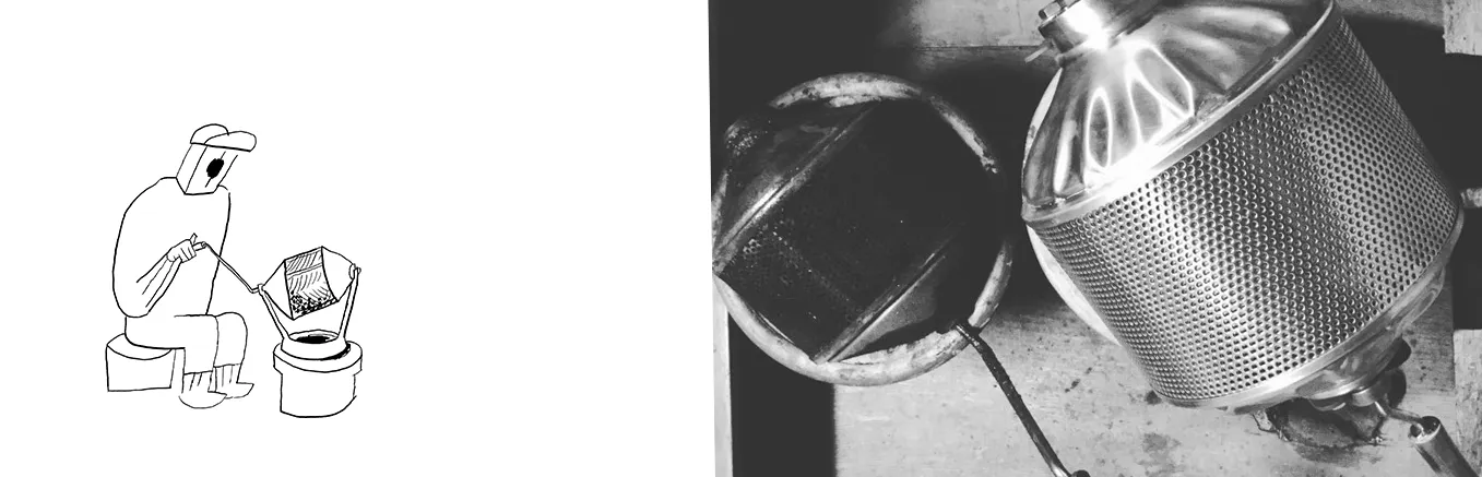 6かく珈琲の珈琲豆は、七輪の炭火の上で手でくるくると回すロースターでの自家焙煎。出来上がりは、6感をフルに使って決める。人にしかできない仕事。 使用するのは、より自然に近い状況で育てられた珈琲豆。 「出来る限りアナログな手法での製造を心掛け、自然が作り上げた味を崩す事なく届けたいと思っています。」