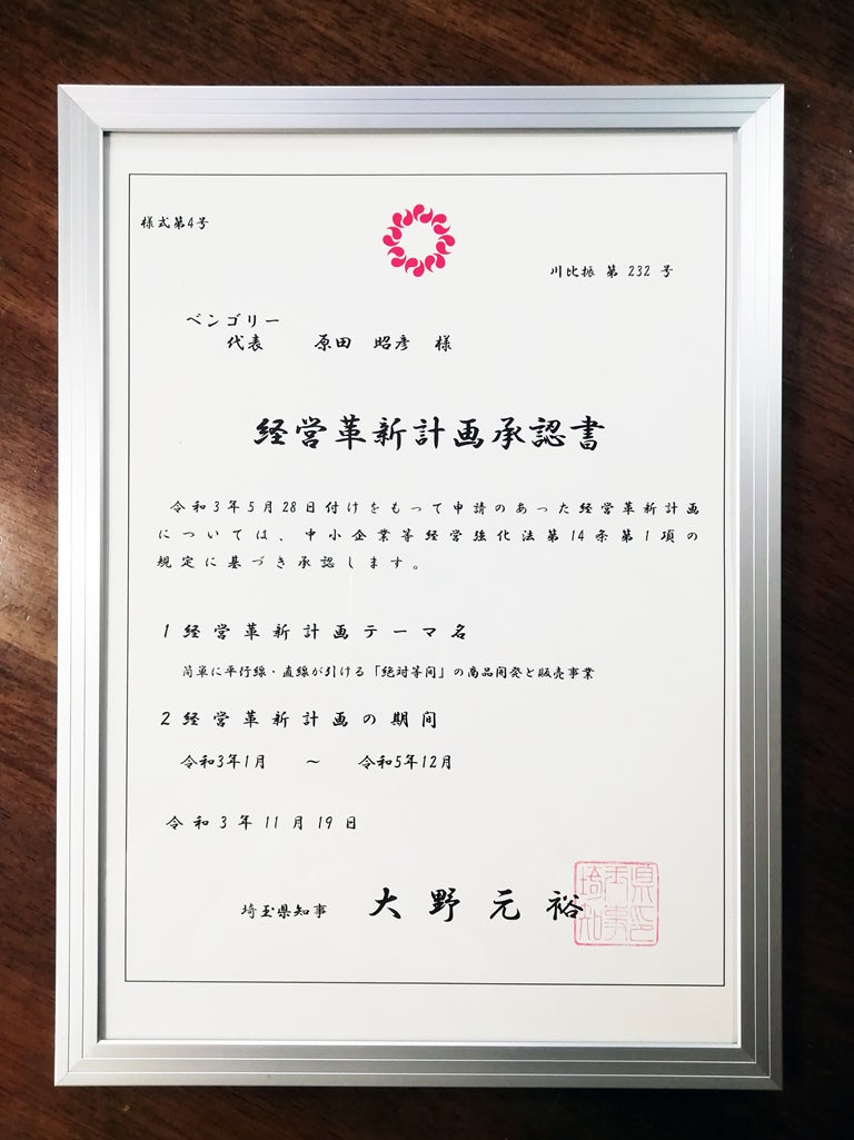 「絶対等間」は、商品開発と販売事業の計画を立て、2021年11月19日に埼玉県から経営革新計画の承認を受けました。