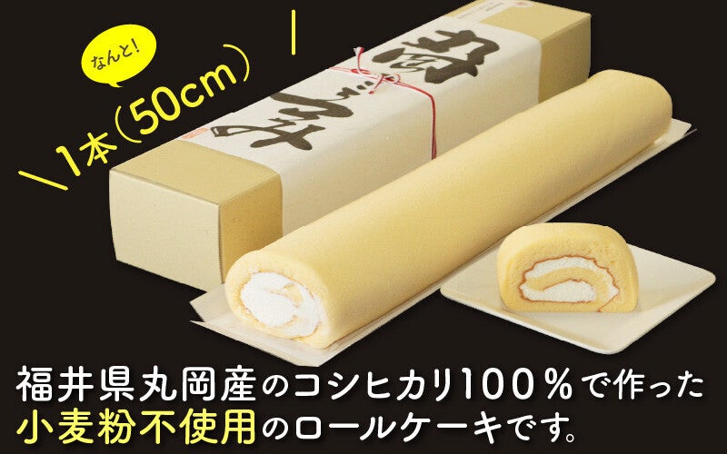 『コシヒカリ発祥の地』、福井県丸岡産のコシヒカリを製粉した100%米粉で作っています。小麦粉を使用していないロールケーキです。”ふわふわもちもち”の米粉ならではの豊かな食感をお楽しみいただけます。厳選した純生クリームをたっぷり巻き込んだ50cmの特大サイズ。サプライズ間違いなしです!