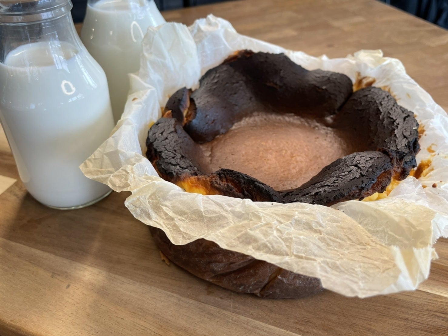 純生クリームとクリームチーズを贅沢につかいました。上は少し焦がして中は濃厚なチーズ感のあるバスクチーズケーキです。