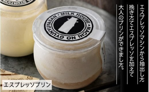 濃厚プリンとふわふわのミルクムースが二層に重なった贅沢な味わいと、挽きたてエスプレッソがはいった大人のプリンです。牛乳屋さんの美味しい牛乳と純生クリームをたっぷり使った贅沢プリンに、エスプレッソマシンから抽出した挽きたてエスプレッソを加えて大人の味わいに仕上がりました。