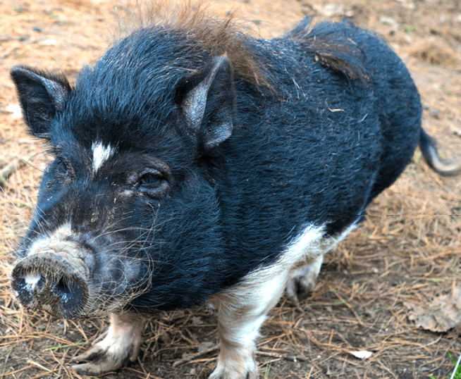 出荷直前の60日前から、さつまいもを与えられて育つ「六白黒豚」。