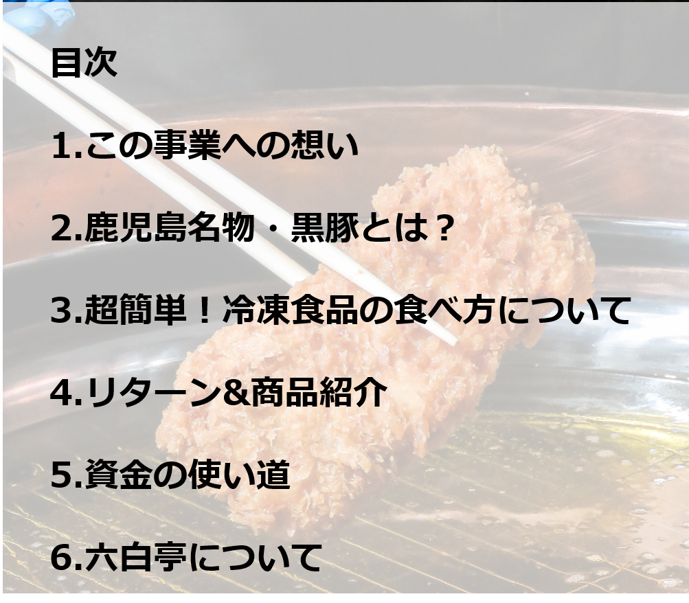 「黒豚を食べたいけど鹿児島県に行くことができない、、」「家で食べたいけど油を使って揚げるのは大変、、」こんな課題を解決するために今回は「六白亭」で取り扱っているブランド黒豚を冷凍の通信販売で販売します。