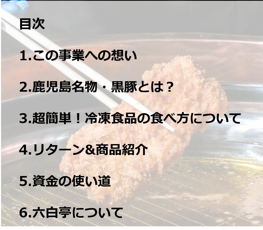 「黒豚を食べたいけど鹿児島県に行くことができない、、」「家で食べたいけど油を使って揚げるのは大変、、」こんな課題を解決するために今回は「六白亭」で取り扱っているブランド黒豚を冷凍の通信販売で販売します。