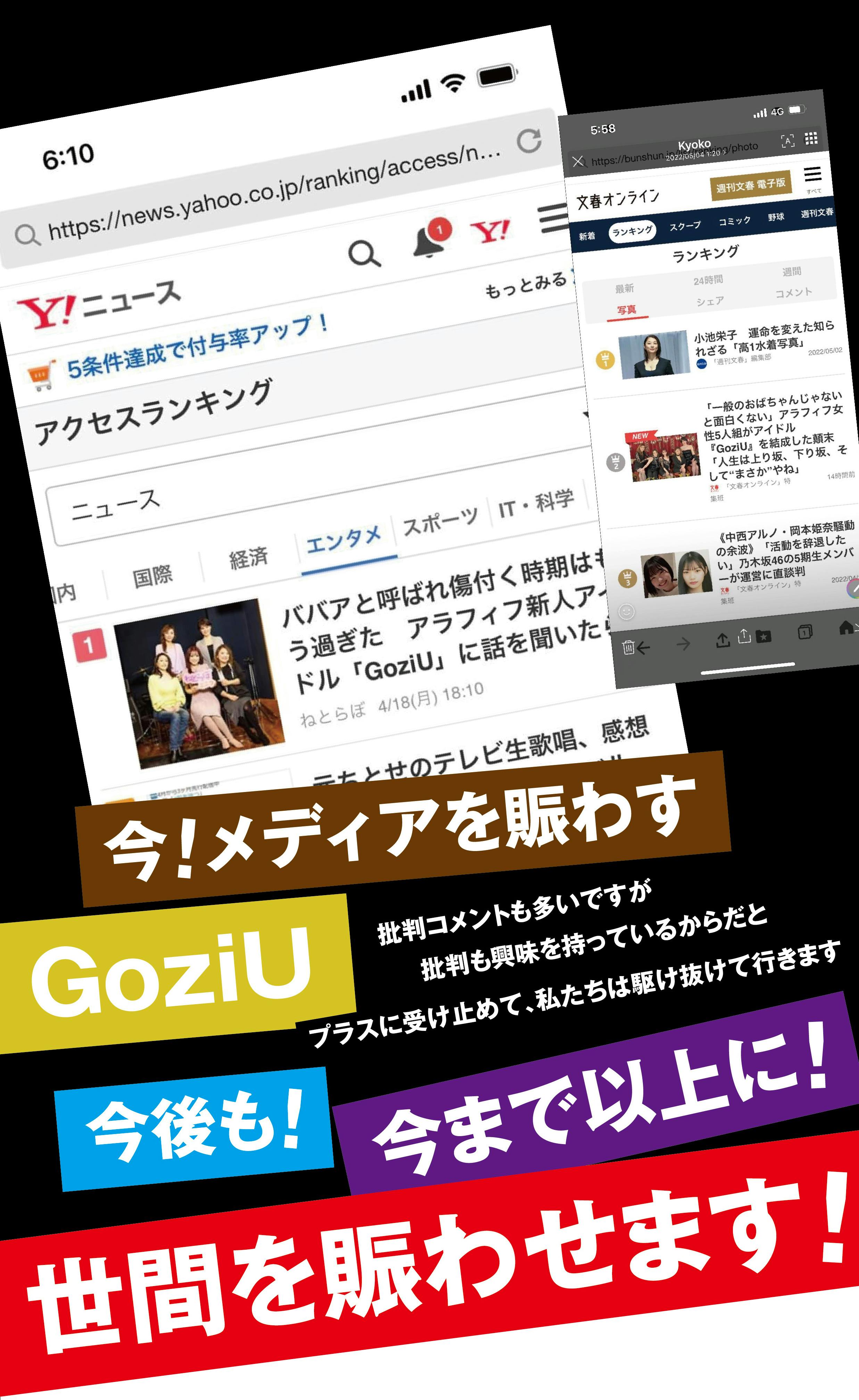 アラウンドフィフティのアイドルブループです。一般的なアイドルと違い、GoziUにはメンバーそれぞれの生きてきた様々な価値観があり、ストーリーがあります。日本を元気にするためには、現状の日本の常識を覆す必要がある、と私たちは考えています。つまり私たちは、新しい価値観を発信することで、もっと人生において、多くの選択肢があることを歌と踊りを通して伝えていきたいと思っています。