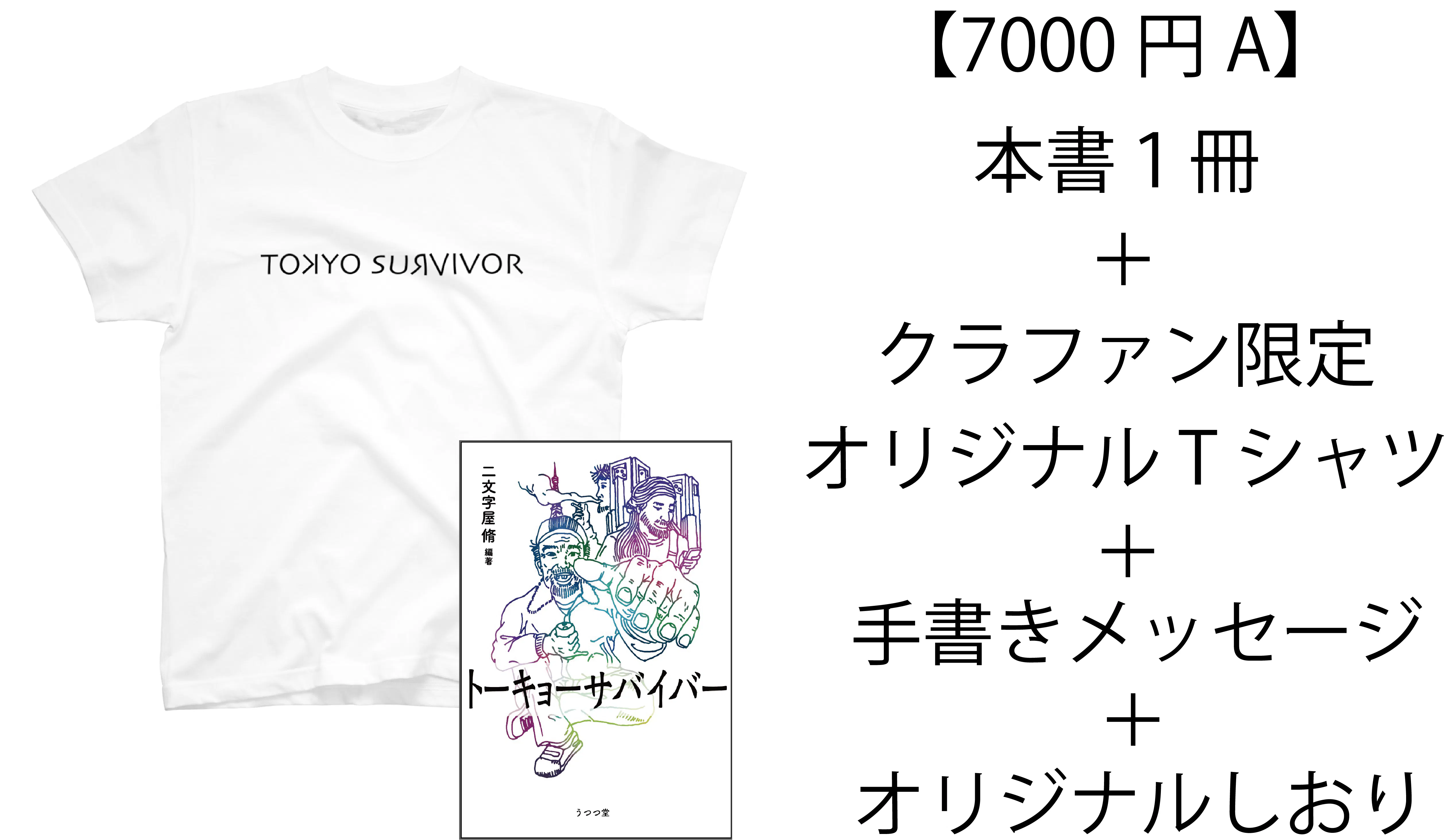 ・7,000円A(書籍1冊、クラファン限定オリジナルTシャツ1枚、手書きメッセージ1枚、オリジナルしおり1枚)