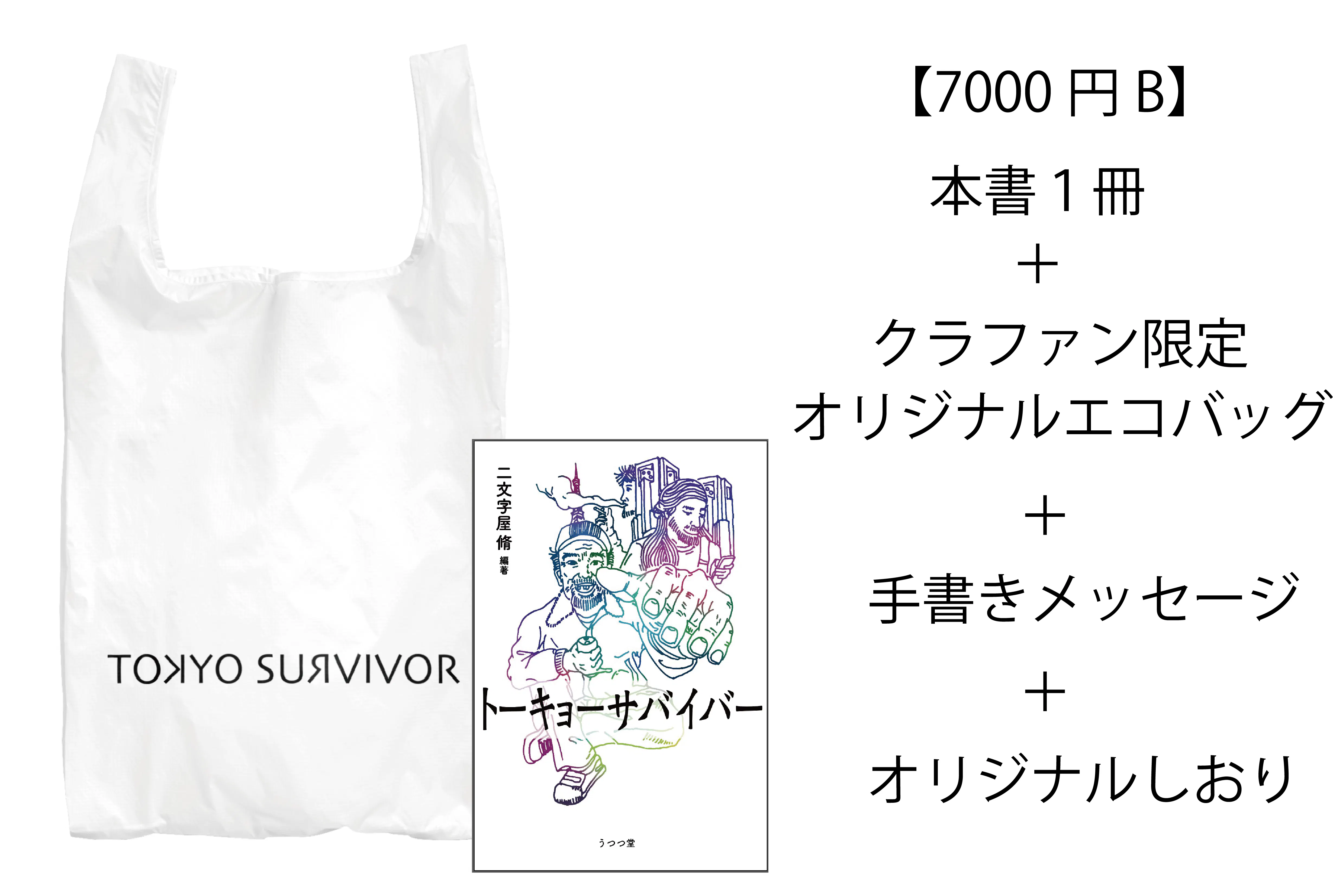 本書『トーキョーサバイバー』1冊。クラウドファンディング限定のオリジナルエコバッグ1点。執筆者でもあるプロジェクト参加学生からの手書きメッセージ1枚とオリジナルしおり1枚を同封いたします。