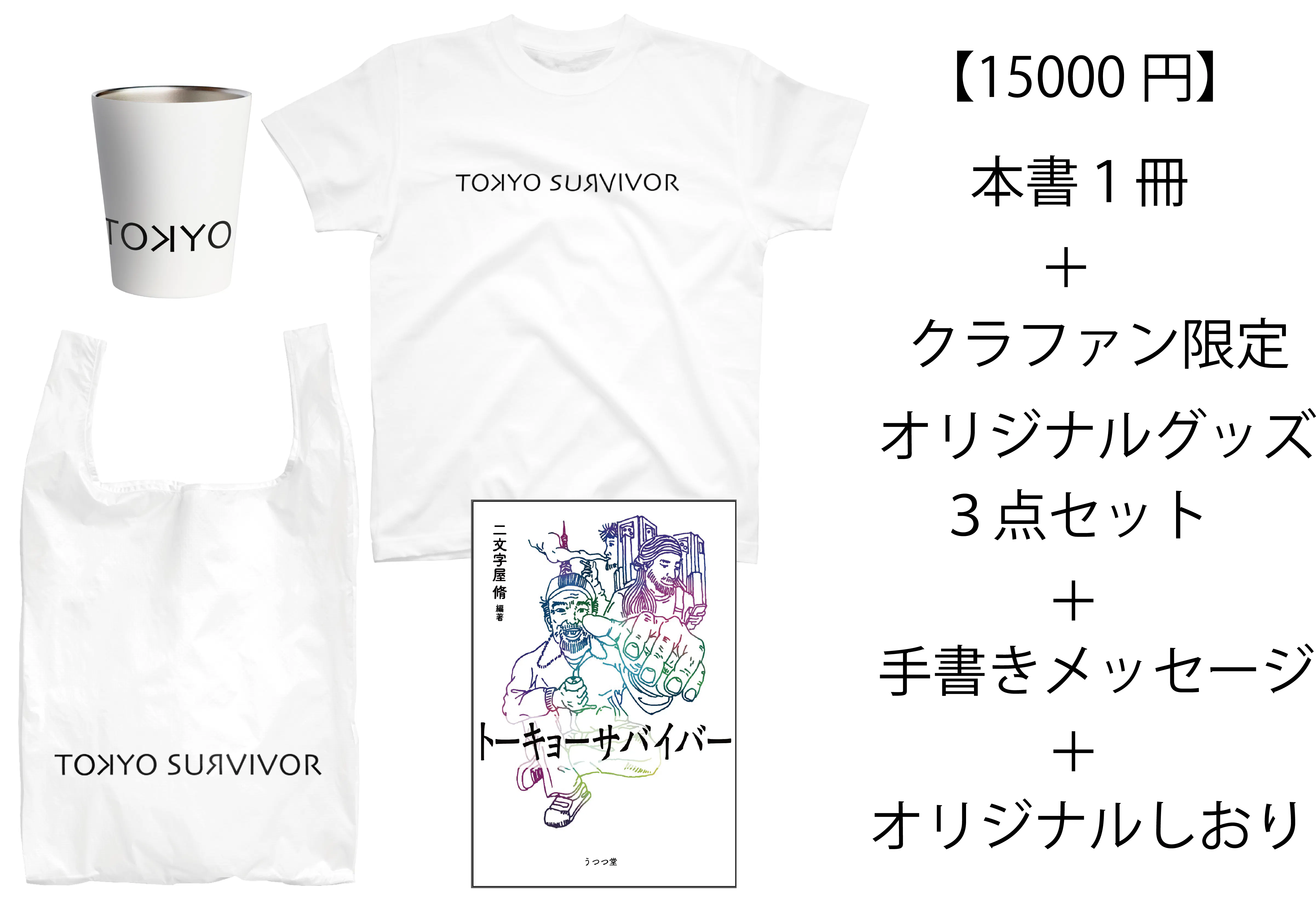 本書『トーキョーサバイバー』1冊。クラウドファンディング限定のオリジナルTシャツ・エコバッグ・タンブラーの3点セット。執筆者でもあるプロジェクト参加学生からの手書きメッセージ1枚とオリジナルしおり1枚を同封いたします。