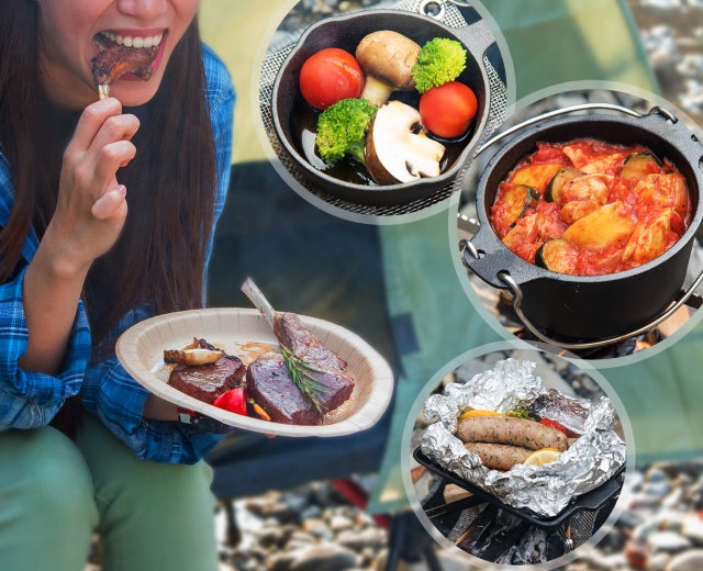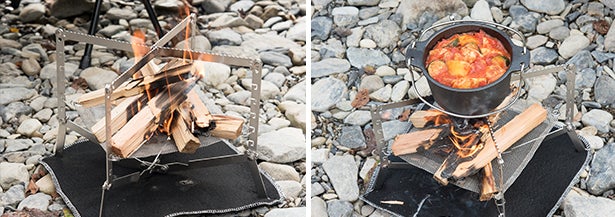 一般的な焚火台は、焼き網やスキレットなどの調理器具が載せられない構造のものが多いですが、本商品なら上部のアームがクロスして五徳として利用でき、直火BBQはもちろん調理器具を載せた調理も可能。
