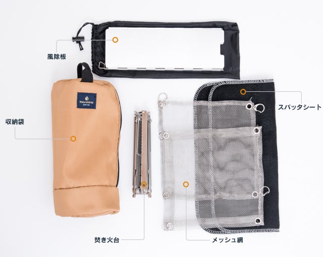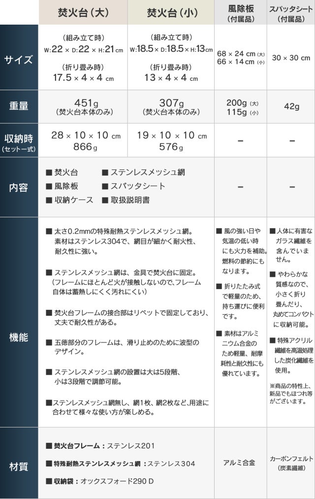 ※本焚火台は一般に流通しているものとは異なります。メッシュ網とフレームとの接合での利便性、耐久性を持った仕様にし、専用スパッタシート、風徐板のセットとし商品化しました。