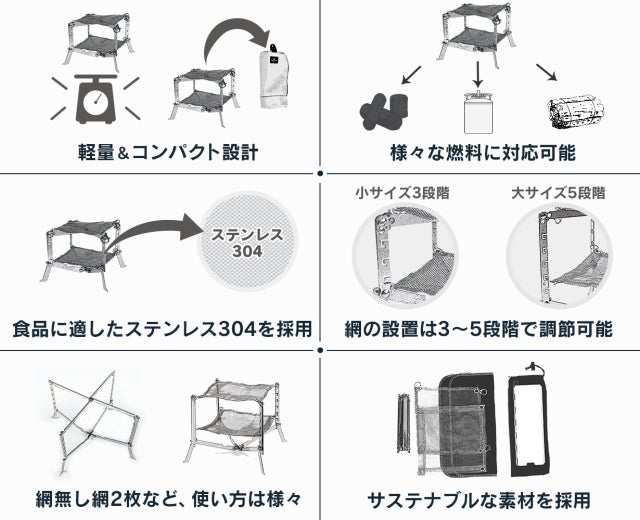 軽量、コンパクトでありながら、焚き火だけでなく、料理も楽しめるように設計されています。