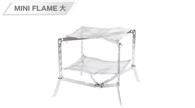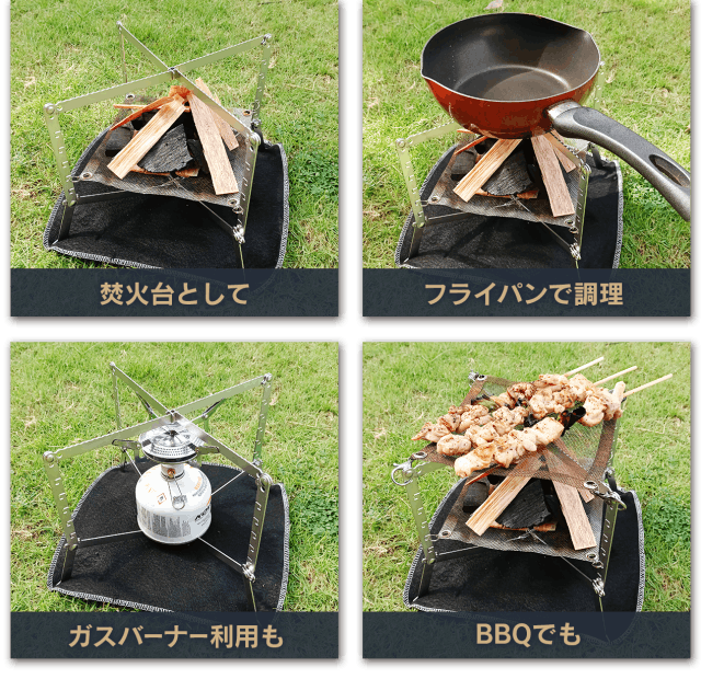 網1層で焚き火のみでも、網1層で調理器具を使っても良し、網2層でBBQでも良し。
