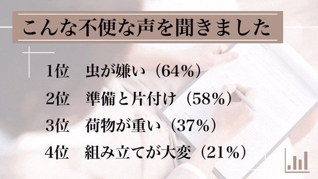 多くの方が「準備と片付けに時間がかかる」「荷物が重くかさばる」「組み立てが大変」と感じていることが明らかになりました。