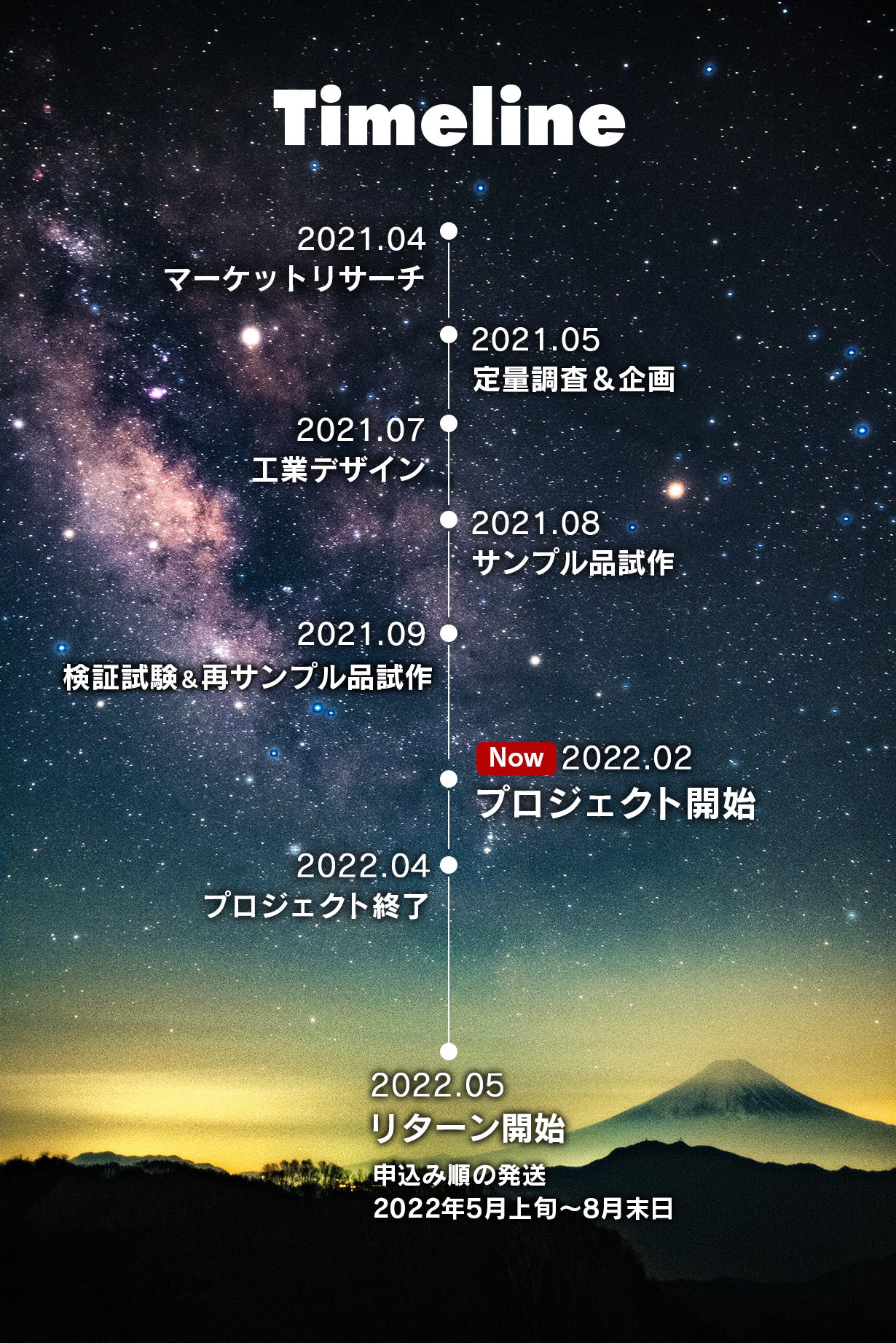 ※ウイルスや計画停電などの影響でリターンの発送が遅延しないよう、本プロジェクトでは前倒しで量産しております。 そのため、プロジェクト終了時点で、順次スムーズに発送できることをお約束できます。