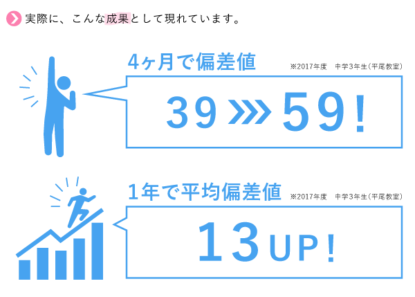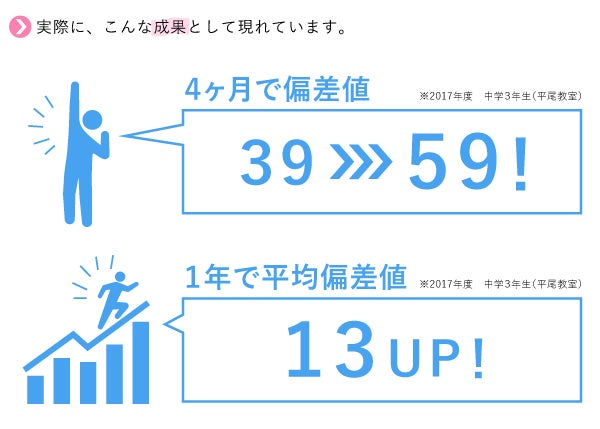 コツコツと目の前の一問一問に向き合ってきた成果は、成績という目に見える形で必ず 現れてきます。自分の力で正解を導き出せるようになった充実感は、やる気を伸ばし 勉強をすることが、苦しみから楽しみへと変わってゆきます。