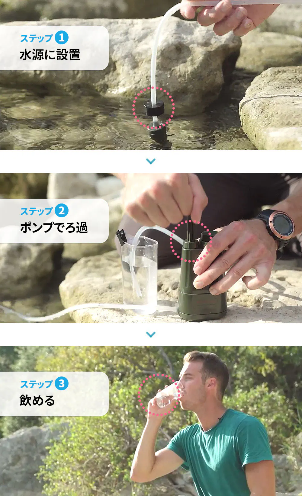 『3つのフィルター』で3ステップで水をろ過。