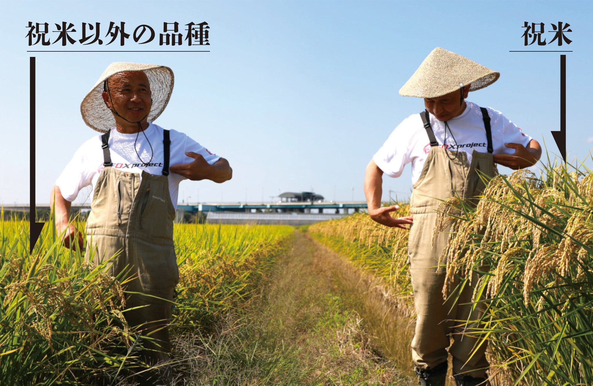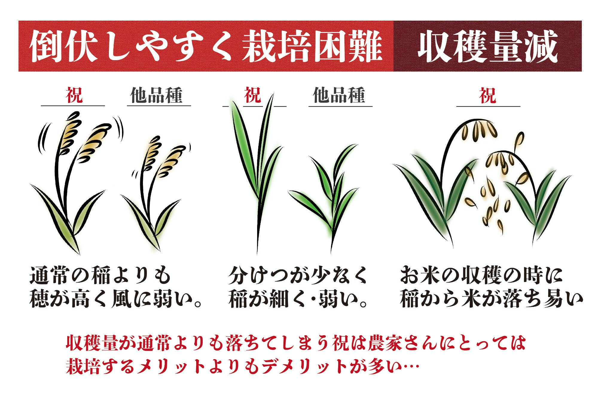 祝は穂高が高く、倒れやすいんです。また、成長期に稲穂が分けつ(根本が分かれて新しい茎が出る)しにくく、穂の束が少ないため穂の丈夫さに不安があるのです。