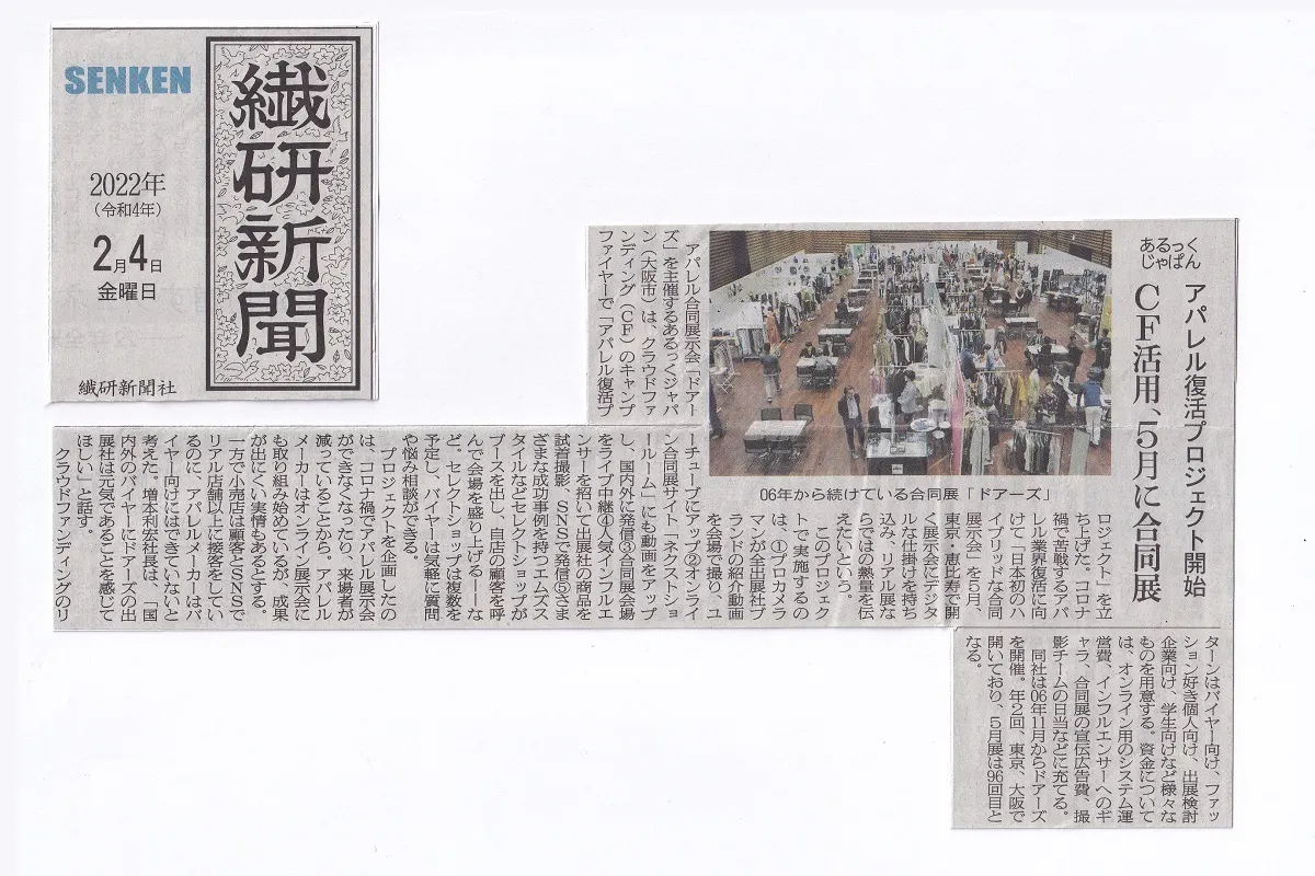 繊維・ファッション関連の業界紙である『繊研新聞2020年2月4日付け』のTOPページに当プロジェクトが紹介されました。