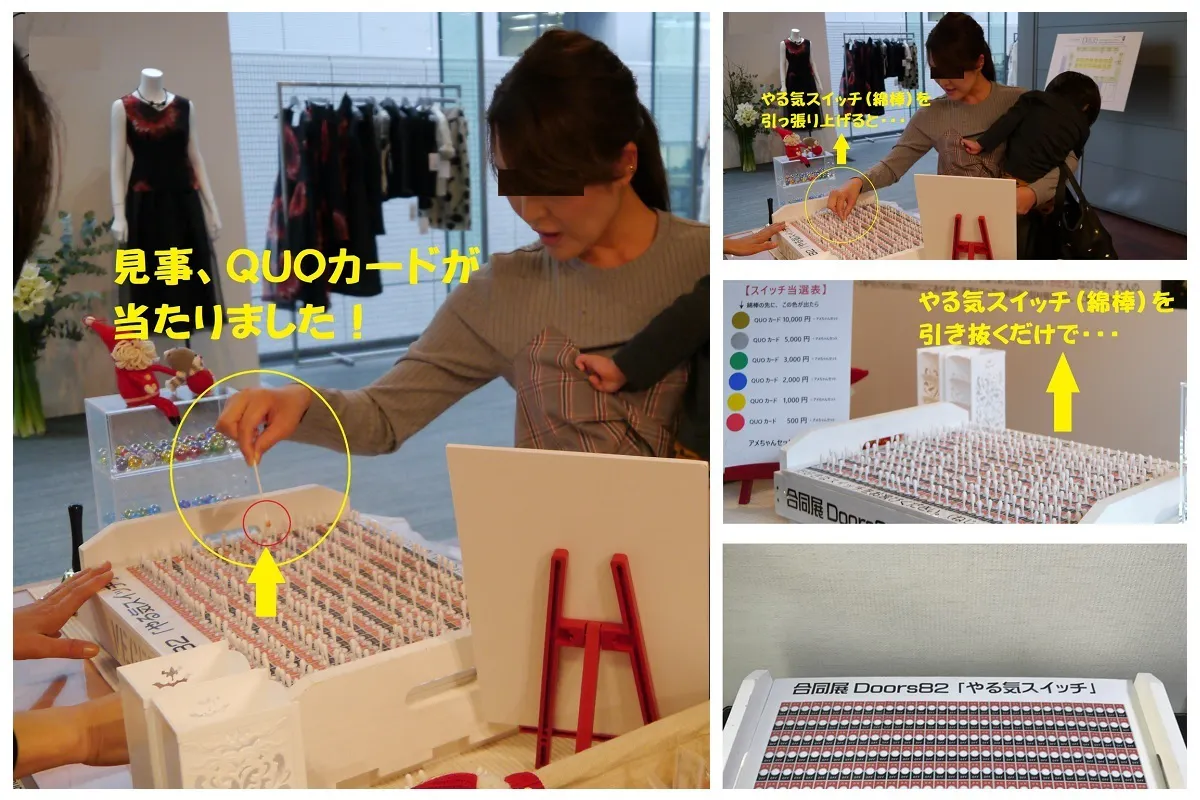 以前行なった「やる気スイッチの抽選会」(当たりはQUOカード500円~10,000円)が会場で大いに盛り上がりました。ご来場のお客様には本当に喜んで頂けました。皆様のご支援があればこんな楽しいコトが出来ます。合同展Doorsには、他の合同展では味わえない発見と出会いと楽しみがあります。笑顔一杯の会場の熱量をオンラインでもお伝えできます。それが今回の「プロジェクトの本当の意味」ですから。