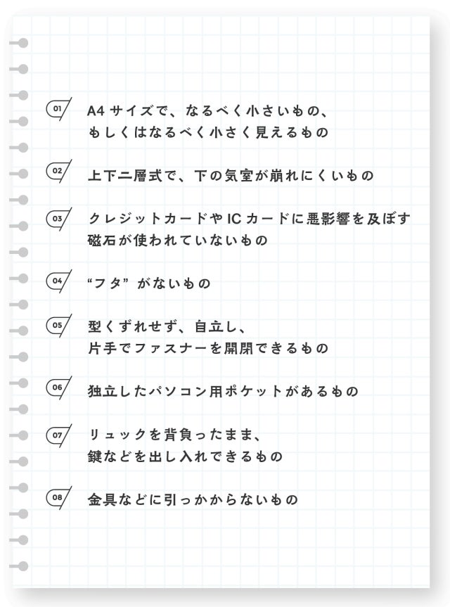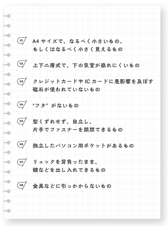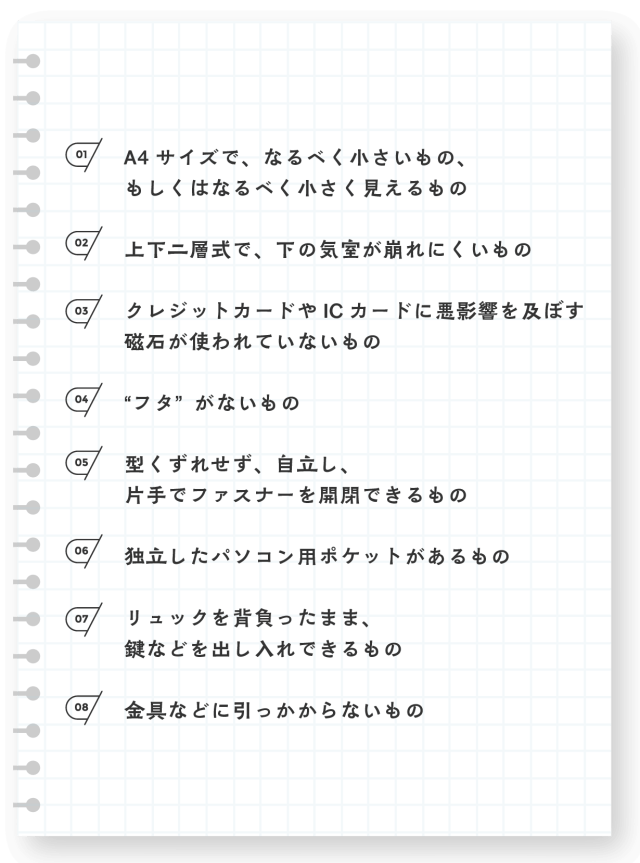 その後、「私の『困った』を何とかしてくれるかもしれない」という期待を、「理想のカバン」へのリクエスト(以下)に託していただきました。