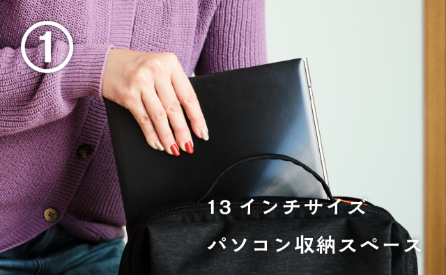 バッグの背中側にはパソコン(13インチまで)を収納できるスペースを設けています。メインスペースから独立しているため、他の荷物と干渉することはありません。