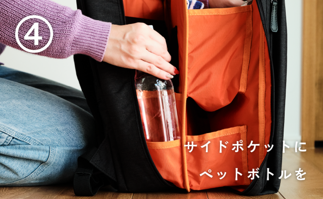 背中側の右サイドポケットには500mlペットボトルや折り畳み傘が入ります。