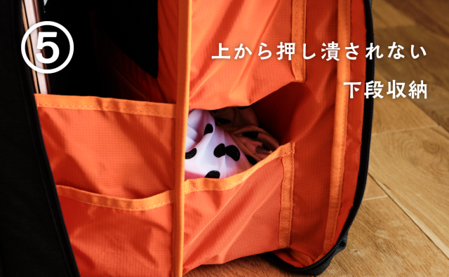 メインスペースの下段は上段と干渉しないセパレート設計。重い荷物を上段に、軽い荷物を下段に置いても押し潰されにくくなっています。