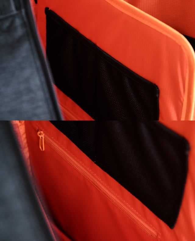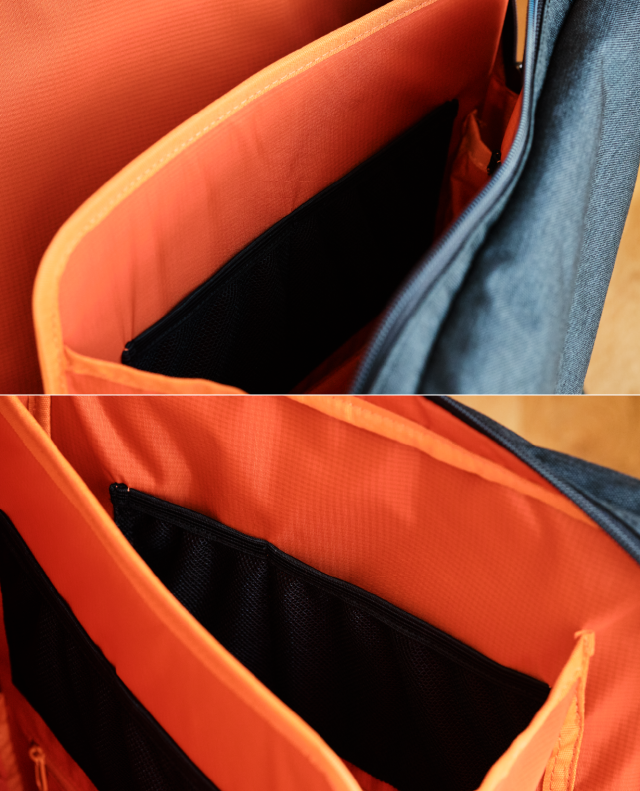 メインスペース:メッシュポケット x2、ファスナーポケット x1