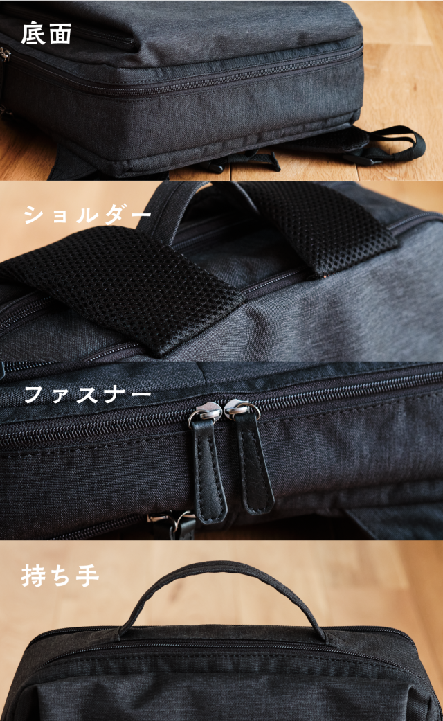 多機能な中身とは対照的に、シンプルな見た目が特徴です。KABAGの顔となるデニム風生地は、カジュアルな服装からビジネスシーンまで対応可能。