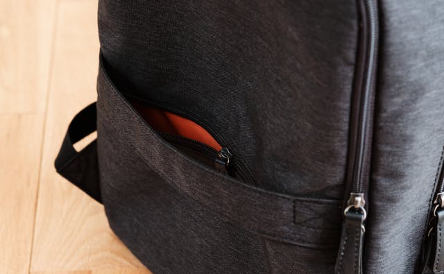 手帳や文庫本の収納に便利なフロントポケットはメインポケットから独立しているので、背負ったままでもスムーズに出し入れできます。左右にチャックがついていますが、別々の部屋になっているため仕分けが可能に。目立ちにくい縦ファスナーが、洗練された印象を与えます。