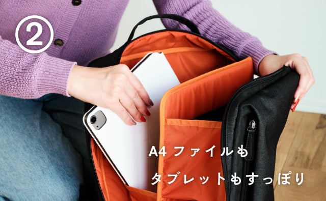 コンパクトサイズでありながら、バッグの背中側にあるメインスペースはA4ファイルやタブレットといった小物も収納できます。