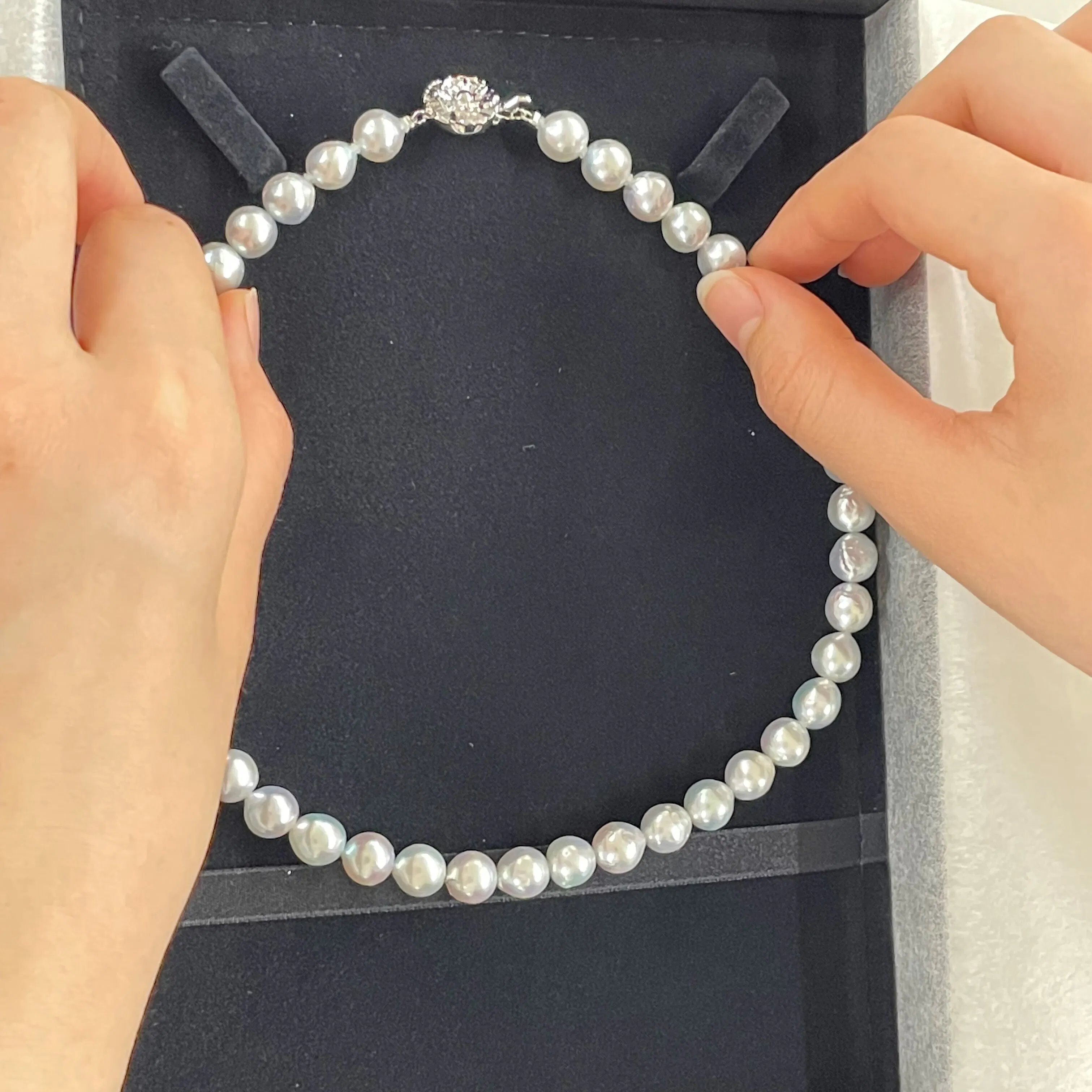 真珠の色は調整していない自然の色味(ナチュラルブルー)になります。