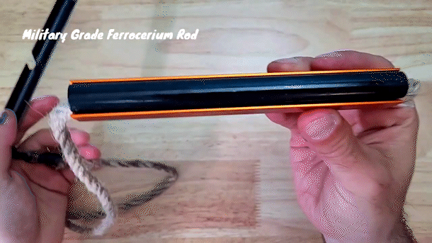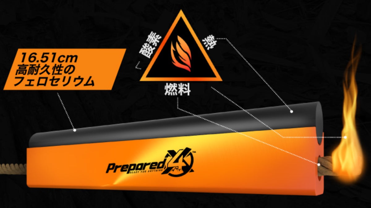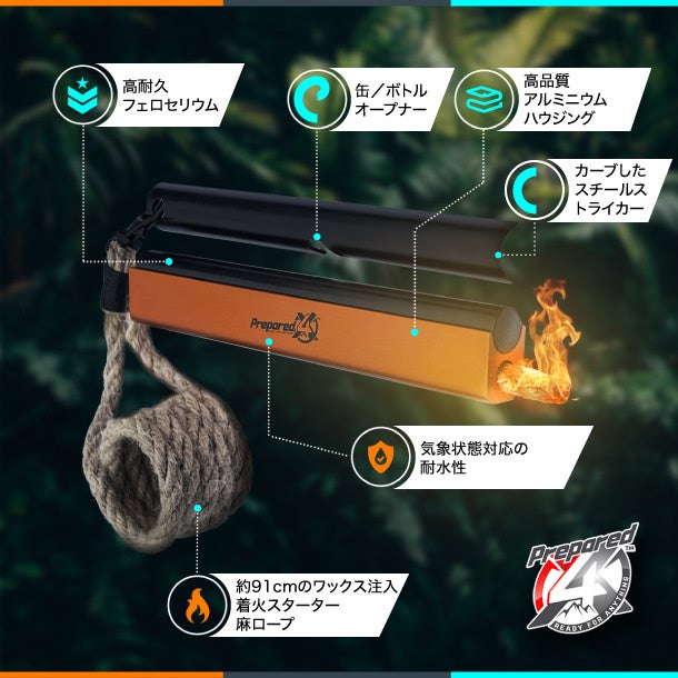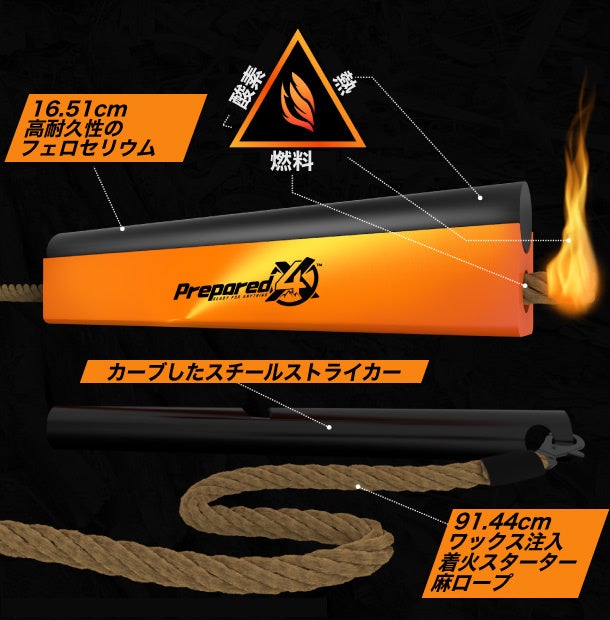6 x ½インチ(91.44㎝)のミリタリーグレードのフェロセリウムを使用したこのファイヤースターターは、一撃で瞬時に輝く火花のシャワーを発生させ、カーブしたスチールストライカーによって芯に直接導かれ、火種や薪、熱い石炭の火をすぐに燃やすことができる強力な炎を生み出します。