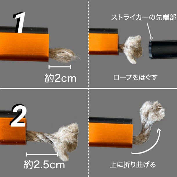 1. ストライカーの切込み部分を使って、着火ロープ先端の約2㎝をほぐす。