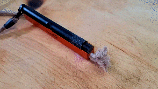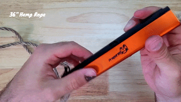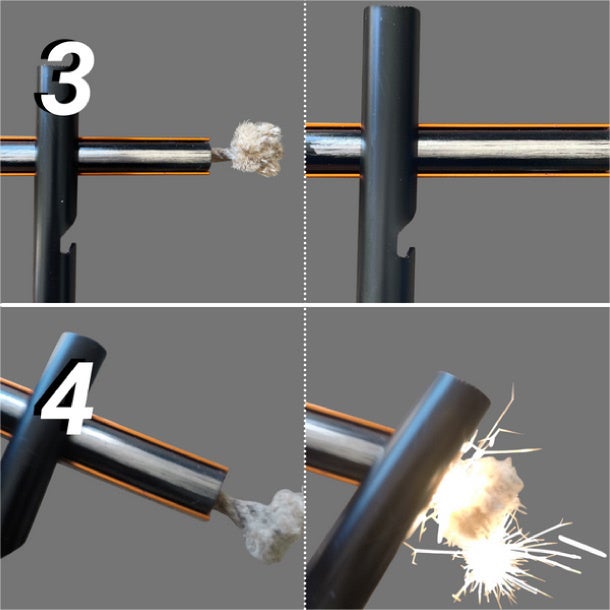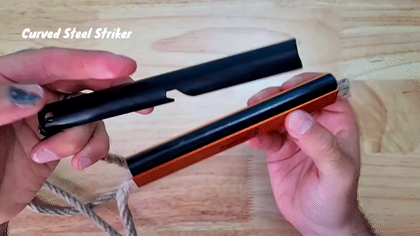 4. スチールストライカーをアルミニウムハウジングに擦るようにスライドさせます。火花が散り、ほつれた麻ロープにきれいに流れて着火します。