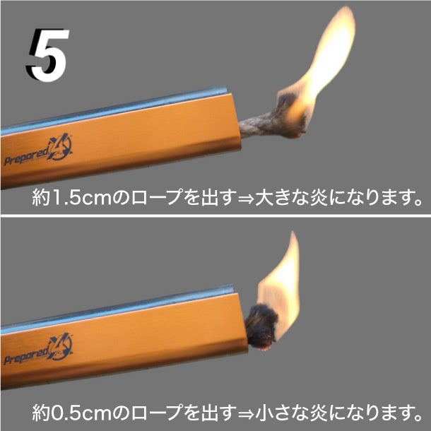 ※1/4インチ(0.635㎝)であれば、必要に応じて1/4インチ(0.635㎝)の芯を出し続けることで、3時間以上炎が持続します。
