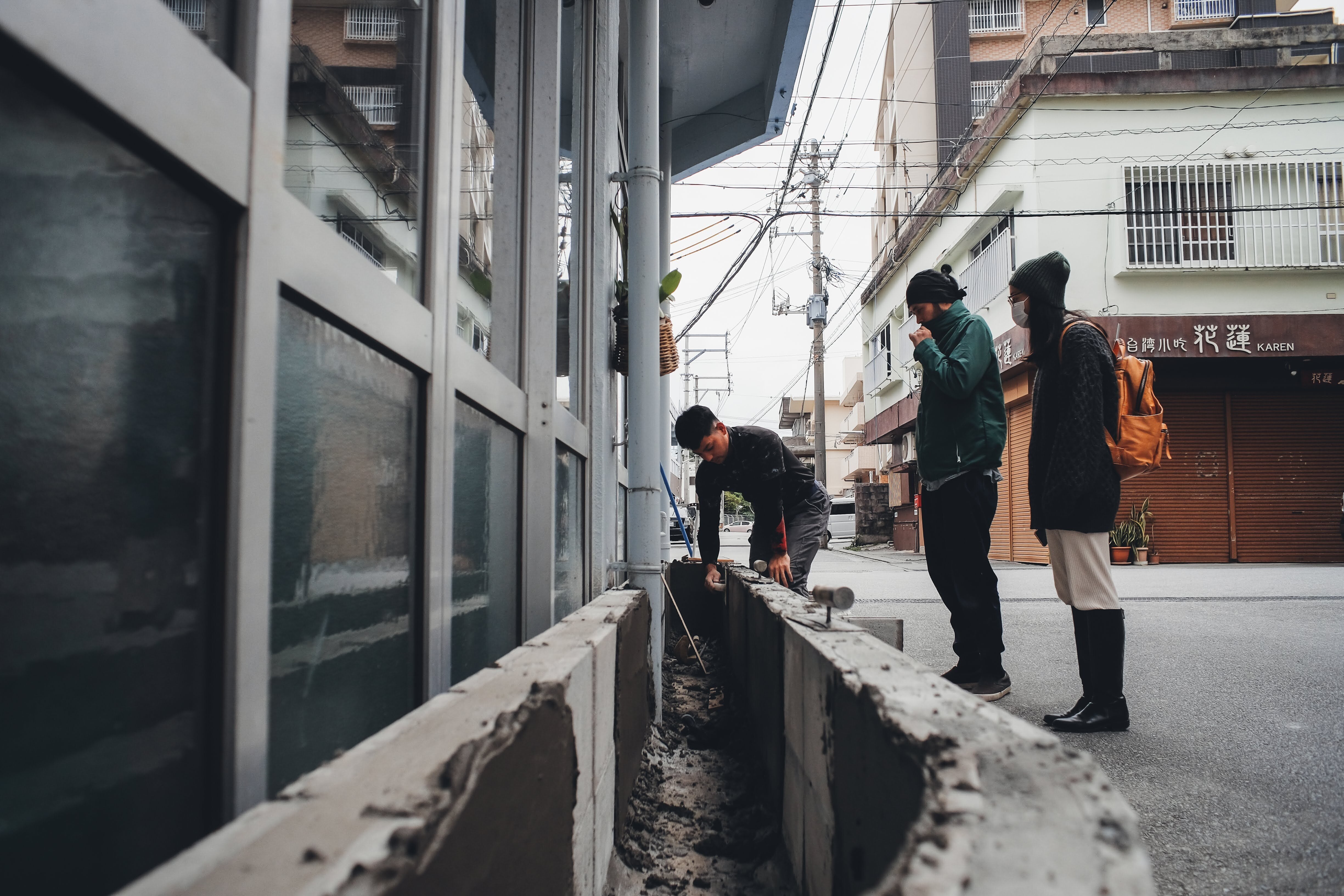 ↑お店の外にはベンチ兼花壇をつくっています。左官屋さんの諸喜田さんの仕事ぶりが素晴らしいです。ここに植物が植えられ、まわりでみんながアイスを食べてくれる日が待ち遠しいです。