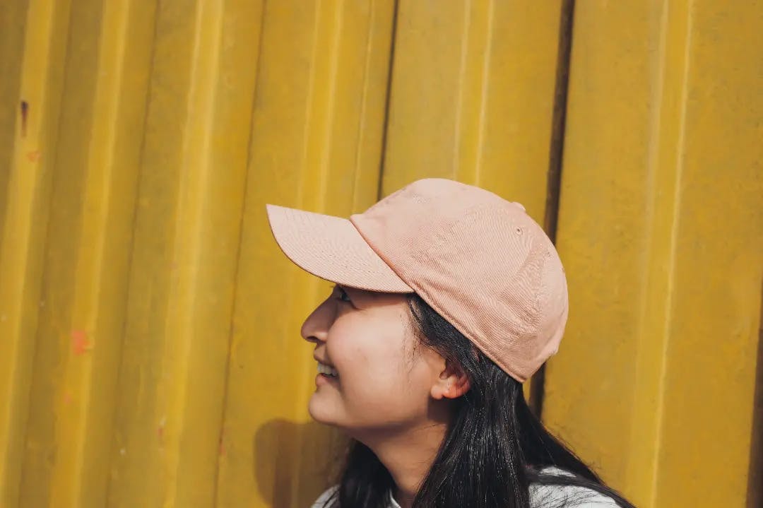 スモーキーなピンクにシルバーのロゴ刺繍。男女兼用で、後ろのベルトでサイズ調整が可能です。