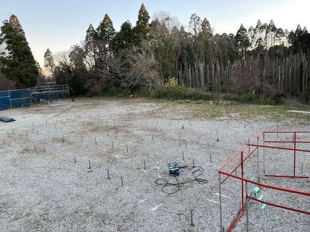 ・元駐車場に設計図に倣って虎ロープを張り単管を埋めていきました。