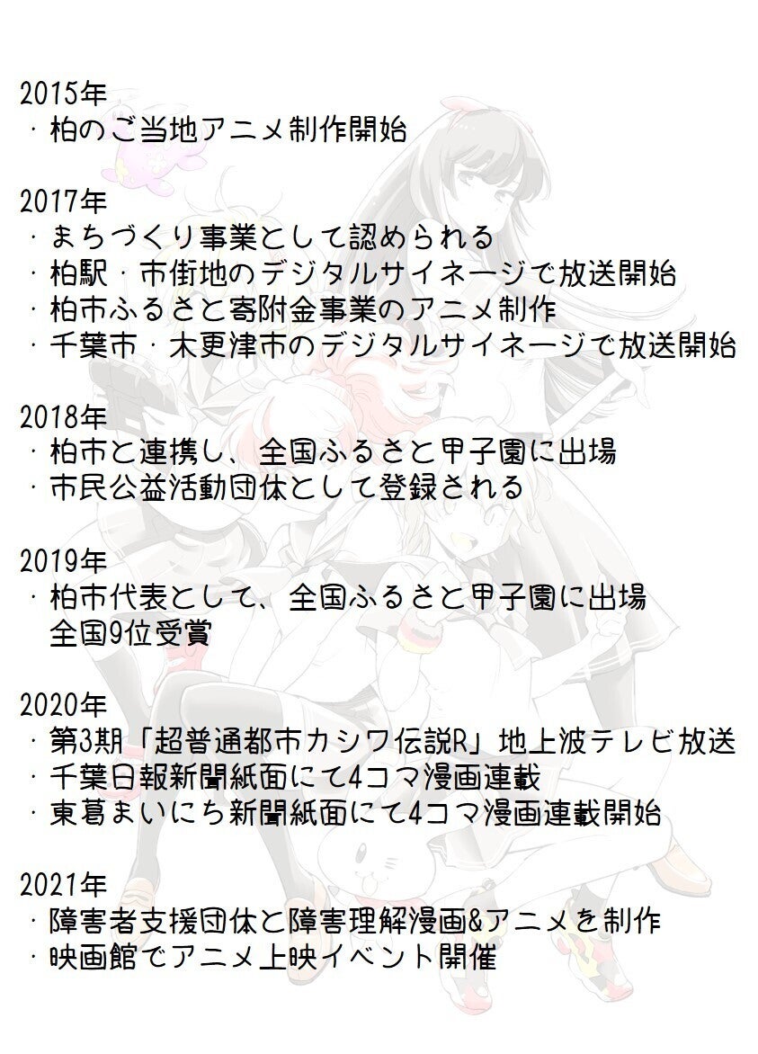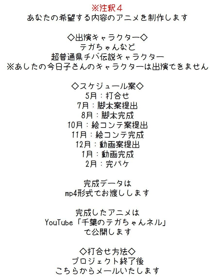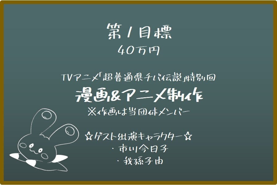 千葉県のご当地ゆるアニメ「超普通県チバ伝説」第6話の漫画およびアニメ制作において、「あしたの今日子さん」のキャラクター「市川今日子」と「我孫子由」が出演するコラボ回を実現させることです。