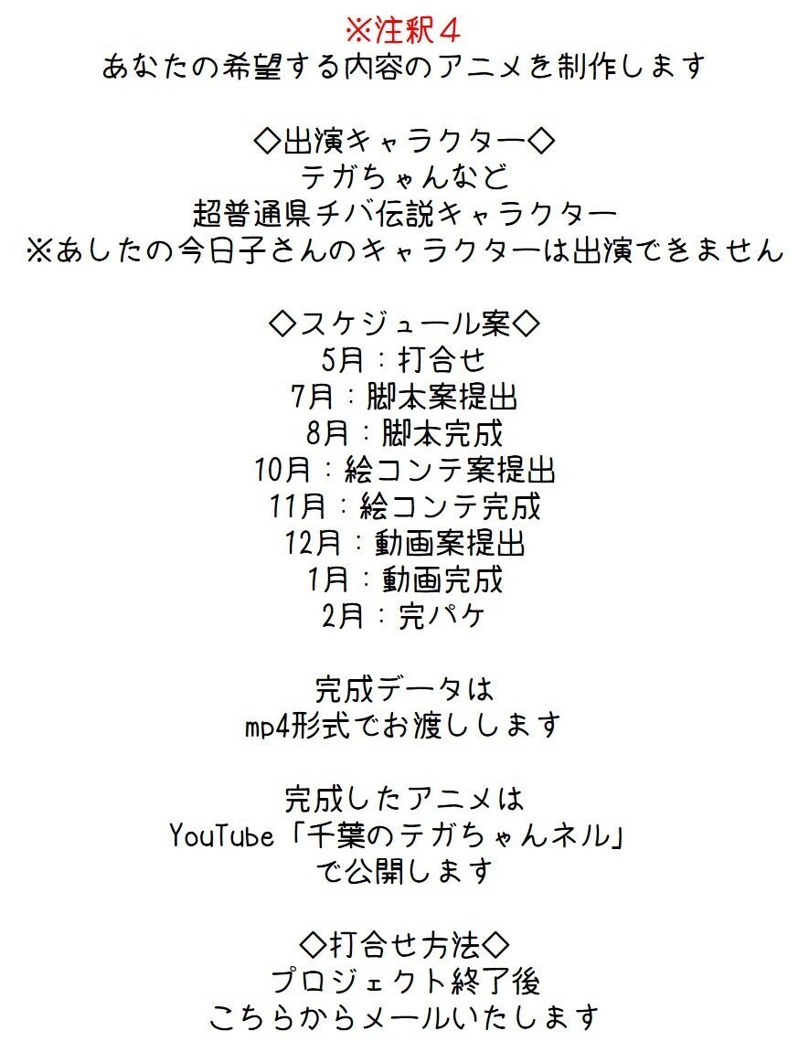 ゲストキャラ出演コースは、今回制作する「あしたの今日子さん」特別回である千葉県のご当地ゆるアニメ「超普通県チバ伝説」第6話に「あなたのオリジナルキャラクター」または「あなた自身」を登場させることができます。