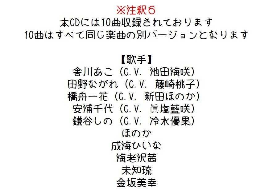 本楽曲は、声優5名・歌手5名が歌う10曲が収録されております。